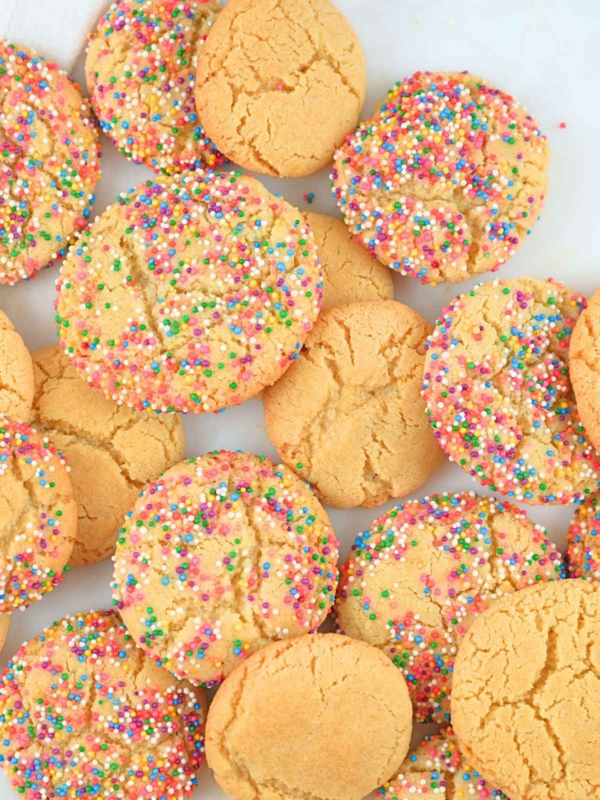 Sugar cookies piled on a counter.