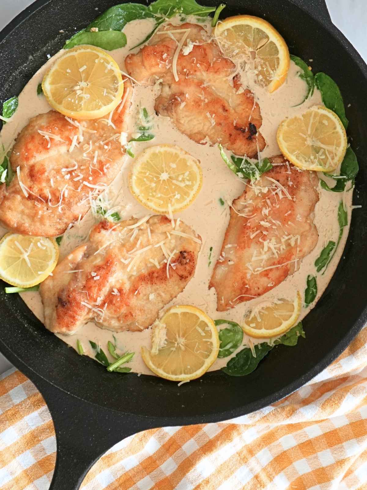 - Main Ingredients: Chicken, lemons, white wine, cream, Parmesan, spinach