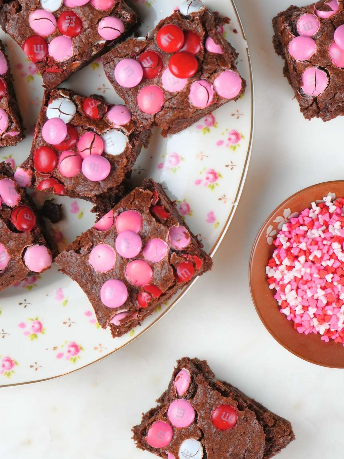- Transfer Batter and Decorate. Transfer the brownie mixture into the prepared baking dish. Use a spoon or spatula to spread the mixture evenly. Sprinkle the top of the brownie mixture with the M&M's.1/2 cup (100 g) Valentine's Day M&M's