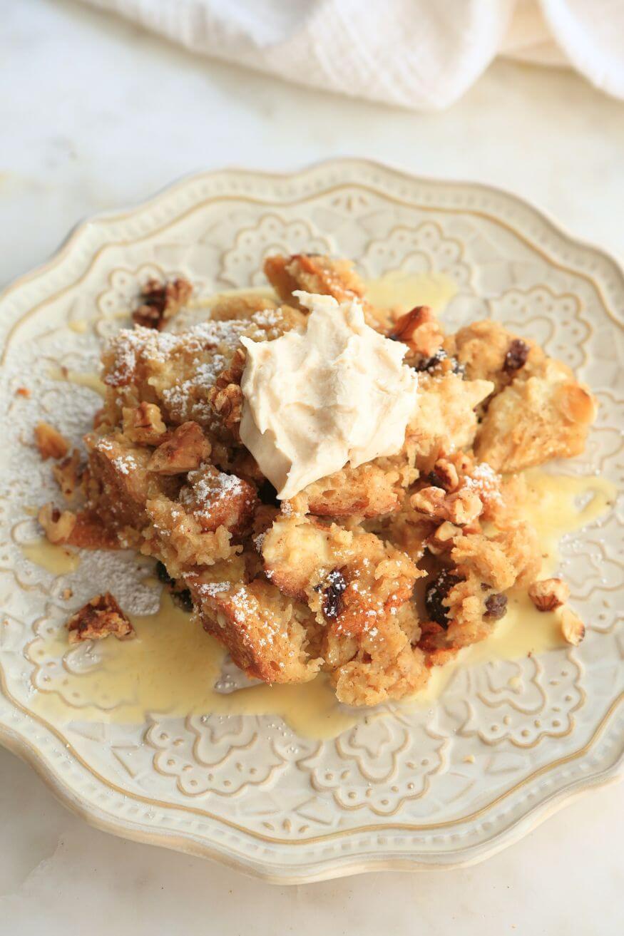 - Place a heaping scoop on the plate. Drizzle it with 1-2 tablespoons (or more) of eggnog, sprinkle with toasted walnuts, and top with a dollop of the butter rum topping. If the bread pudding is cool enough when serving, you can even dust it with powdered sugar for an added touch.