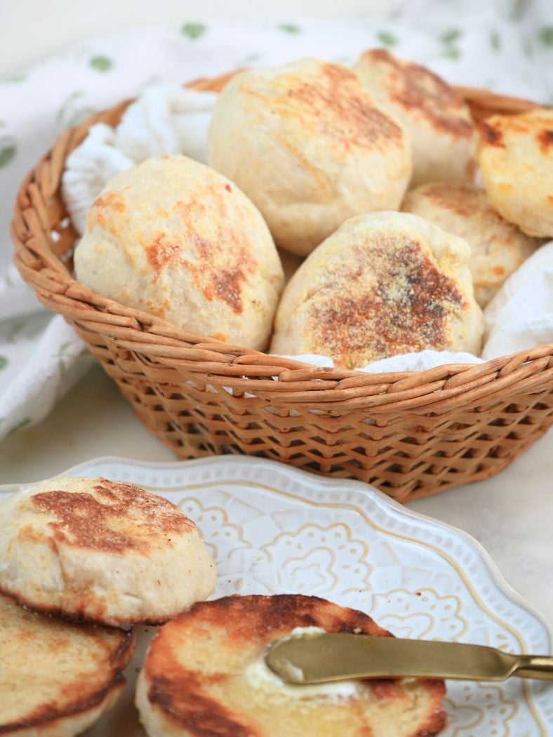 Cornmeal: Dust the English muffins with cornmeal before cooking. I like to save and freeze the extra corn flour left from fresh-milled grits and cornbread with fresh-milled flour, and use it for dusting.